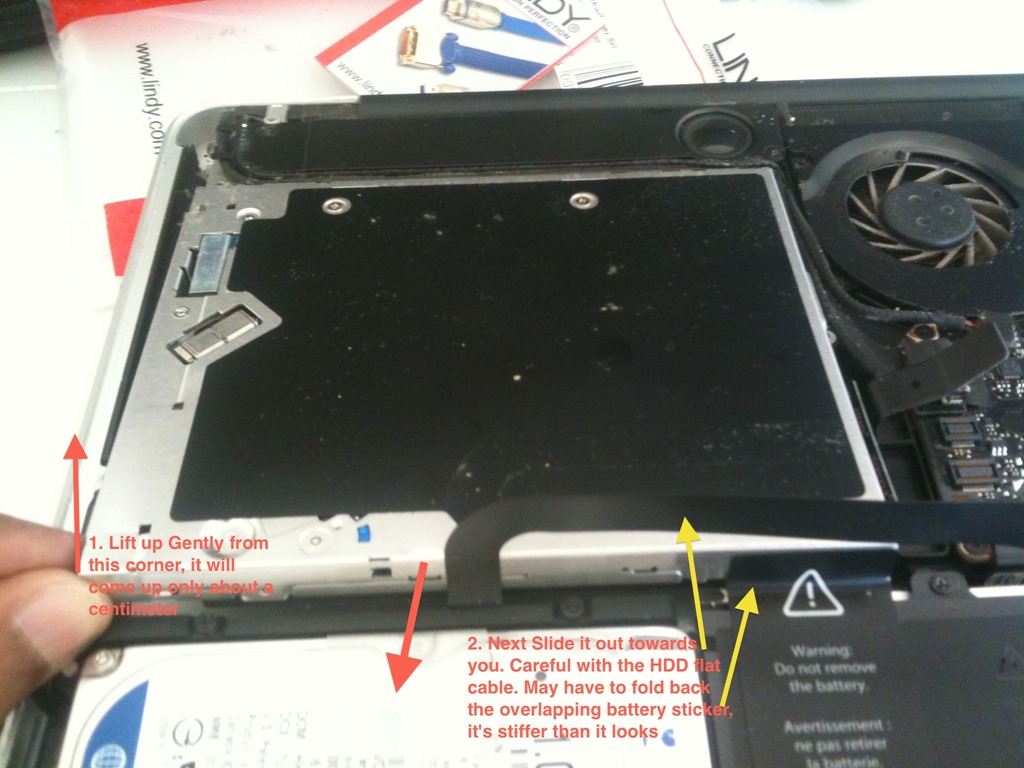 Step 6: Next lift up the Optical drive from the bottom left corner gently. It will come up only about a centimeter then pull it towards yourself. If you encounter resistance bend the battery sticker and the straighten the HDD flat cable, they are stiffer than they look.