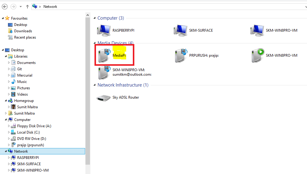 Previously I have blogged about how I converted my Raspberry Pi into a DLNA Media Server. When we moved to UK I brought along my media server and it was up in a jiffy. However, yesterday, when I sat down to build my long pending Windows 8 Media Client on my rebuilt Windows 8 VM, it simply wouldn’t show the MediaPi (name of my Media Server) when I selected ‘Computer’ in Windows Explorer.